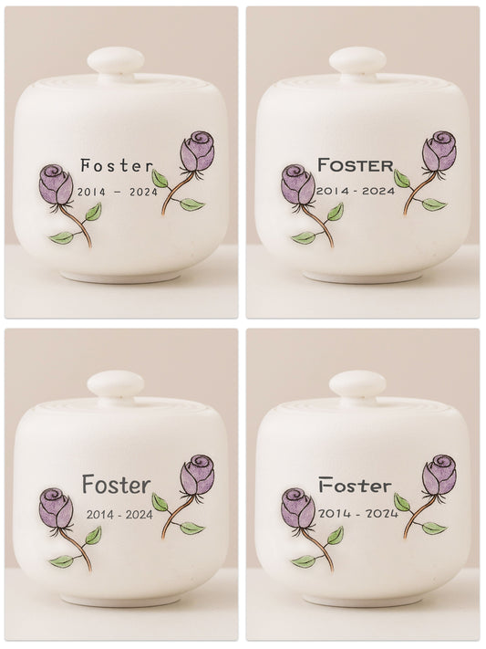 Hand Painted Purple Rose Elegant White Pet Urn Personalized Cat & Dog Pet Urn, Custom Carved Pottery Keepsake Urn